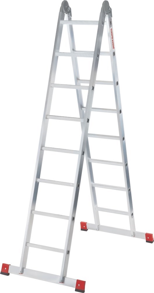 Двухсекционная шарнирная лестница Новая Высота 2х8 604428 обладает повышенной прочностью и надёжностью при небольшом весе, простотой установки и высоким уровенем комфорта. Отличительная особенность таких лестниц-трансформеров - широта возможных позиций, в которых их можно использовать, а также их компактность, что облегчает их перемещение и транспортировку. Регулировка положения лестницы осуществляется с помощью стальных шарниров, которые обеспечивают надежную автоматическую фиксацию выбранного положения лестницы. В целях удобства и безопасности при эксплуатации, лестница оснащена противоскользящими рельефными ступенями.