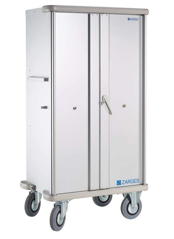 Алюминиевый шкаф Zarges W 105 N 41854 - функциональное транспортировочное и складское средство для, например, чистого белья, грязного белья и многих других вещей. Многоцелевая тележка из анодированного алюминия. Открытая сторона корпуса с профильной рамой по периметру. Угловое соединение за счет уголков из литого алюминия. Гладкие стенки внутри; внутренний размер соответствует проходному размеру в свету. Встроенное уплотнение двери в профиле рамы по всему периметру для высокой звукоизоляции и защиты от пыли. Две дверцы, раскрывающиеся параллельно торцевым стенкам на 270°. Открытые дверцы удерживаются магнитами. Дверные полотна толщиной 2,5 мм, сплошные профильные петли. Центральный замок (легкоходный рычажный) с функцией закрытия сверху и снизу обеспечивает надежное закрытие. Дверцы не раскрываются при транспортировке в грузовом автомобиле. Эргономичная скользящая ручка из анодированного алюминиевого профиля на стороне направляющих роликов. Бамперная рама по всему периметру с устойчивой к износу и воздействию дезинфицирующих средств пластиковой защитой; стойкость к воздействию температур до 95°C. Сверху имеется защитный навес со стороны двери, изготовленная из износостойкой, устойчивой к дезинфекционным средствам пластиковой обивки, выдерживающей температуру до 95°C. Шасси: 2 поворотных ролика и 2 ролика на кронштейнах по углам, диаметр 200 мм, шириной 50 мм, легкоходные, обрезиненные, с подшипниками и защитой от намотки мусора. При использовании соответствующих роликов подходит также для контейнерных прачечных. С двумя несъемными полками.