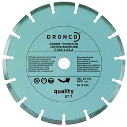 Алмазный диск Dronco ST-7 quality 180 мм - сегментный спеченный алмазный отрезной круг. Универсальный алмазный отрезной круг по справедливой цене. Универсален для строительных материалов. Минимальное количество для заказа 1 шт. Изготовлено в соответствии с EN 13236. Соответствует положениям oSa. Сделано в Германии.