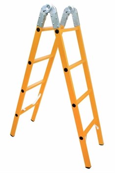 Диэлектрическая шарнирная лестница ЗЭП ЛСПТС-2х2,5-55 - это стекловолоконная лестница, состоящая из двух секций, соединенных между собой шарнирными замками. Шарнирный механизм позволяет фиксировать различный угол между секциями, это позволяет использовать лестницу-трансформер, как лестницу приставную и лестницу-стремянку. Для изготовления тетивы используется диэлектрический стекловолоконный профиль прямоугольного сечения. На нижних концах тетивы – противоскользящие эластополимерные опоры. Ступени изготовлены из профиля 36х26 мм с противоскользящими ребрами.