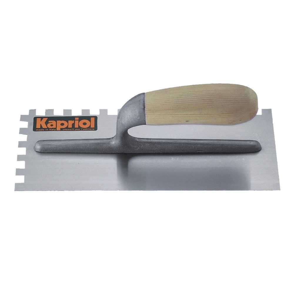 Гладилка зубчатая Kapriol с деревянной ручкой используется для нанесения и распределения различных растворов по стенам, полу и потолку; кроме этого, с её помощью сглаживаются швы и большие неровности.