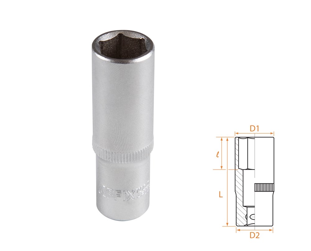 Размер 14 мм Посадочный квадрат 3/8" Рабочий профиль 6-гранный Рабочий диаметр (D1) 20,0 мм Диаметр в основании (D2) 18 мм Рабочая глубина (l) 28 мм Общая длина (L) 63 мм Материалы инструментальная сталь Cr-V, хром Размеры 63×20×20 мм Вес 0,073 кг
