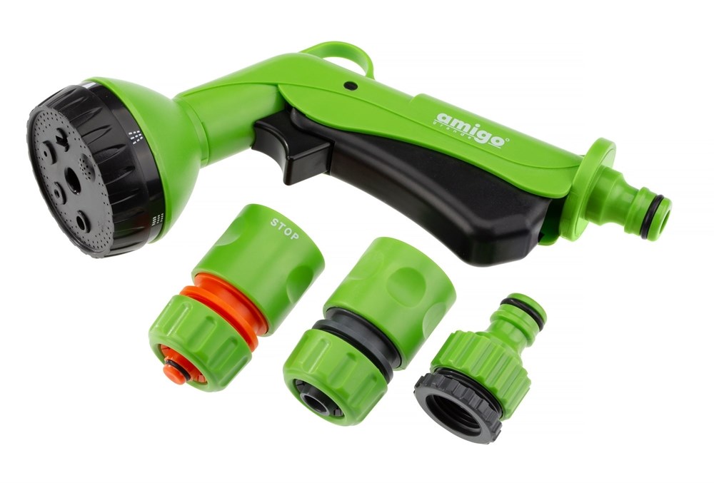 Комплект для полива Amigo 79234 включает всё необходимое для быстрого и удобного запуска системы полива. В набор входят коннектор сквозной 1/2” для подключения к источнику воды, коннектор с аквастопом 1/2” для быстрого соединения пистолета-распылителя без отключения подачи воды, адаптер для крана с наружной резьбой 1/2” или 3/4”, а также пистолет-распылитель с 6 режимами работы. Все элементы изготовлены из прочного термостойкого ABS-пластика, устойчивого к УФ-излучению, что обеспечивает долгий срок службы и надёжность в эксплуатации. Герметичное крепление к шлангу и широкий диапазон рабочих температур делают комплект идеальным решением для современной системы полива.