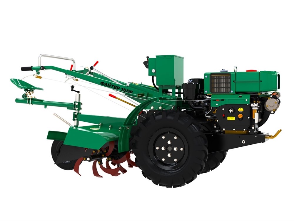 Файтер 15DE поставляется в комплектации с электростартером, почвофрезой, колесами 12' и сиденьем. Ширина захвата почвофрезы — 100 см.