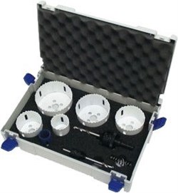 Набор биметаллических коронок для электрика TKE Wilpu 3061000101 в мини контейнере. Типы коронок: 22 мм - 10 зубьев на дюйм; 35 мм, 51 мм, 57 мм, 68 мм, 76 мм - 4-6 зубьев на дюйм. Типы адаптеров: ZE 1 - 14-30 мм; ZE 5 - 32-210 мм. Пружина ZES.