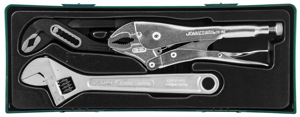 Набор инструмента (переставные клещи, ручные тиски и разводной ключ) Jonnesway 3 предмета в ложементе P2803ST