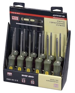 Набор отверток Stayer "MaxGrip" 12шт 25851-H2-12 G предназначен для монтажа и демонтажа резьбовых соединений. Двусторонний стержень из высококачественной хромованадиевой стали. Эргономичная двухкомпонентная противоскользящая рукоятка с упором для большого пальца и отверстием для подвески.