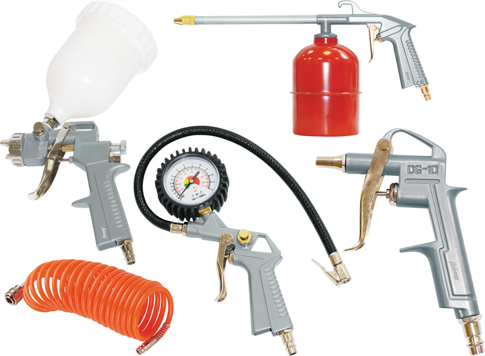 Набор пневмоинструмента 5 предметов (краскораспылитель с верхним бачком) используется в автомастерских и автолюбителями для выполнения различных операций, таких как: покрасочные работы, нанесение антикоррозионного покрытия, продувка деталей от пыли, подкачка шин. Шланг имеет специальную муфту с защелкой, что позволяет быстро менять насадки, тем самым сокращая время на смену операции.