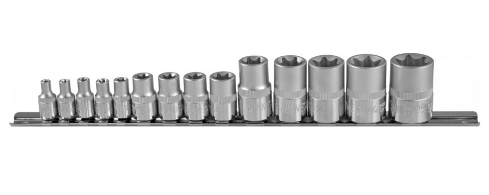 Набор торцевых головок Jonnesway Torx (звездочка), 1/4", 3/8", 1/2"DR, Е4-E24 на держателе, 14 предметов S06H414S - применяется для монтажных работ с болтами, имеющими рабочий профиль EXTERNAL TORX (Е).