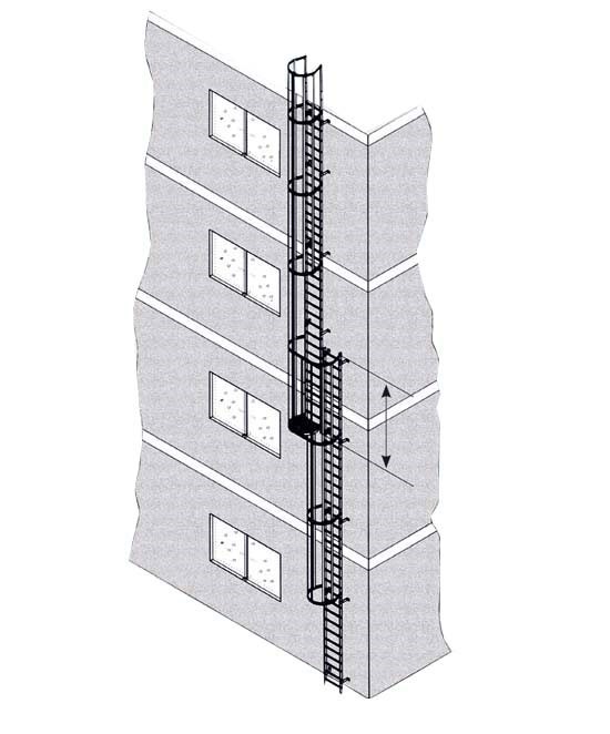 Наружная пожарная лестница Zarges Z600 оцинкованная сталь, 19,1м 58791 - многоходовой вариант доступа в здание и к машинам через переходную платформу. Для стационарного монтажа согласно стандартам BGV D 36 и DIN 18 799-1, DIN 14 094-1 и EN ISO 14 122-4. Настенная лестница с ограждающим кожухом по BGV D 36. Соответствие стандартам DIN 14 094 и 18 799 в части 1. Ширина лестницы: 520 мм. Стенное крепление с различными расстояниями от стены, до 600 мм по выбору. Расстояние между настенными креплениями составляет не более 2,00 м. При этом для монтажа каждой лестничной секции используют не менее двух креплений. Шкафы для предохранителей, блокировка проходов, а также площадки можно выбирать по требованию. Нестандартные лестницы изготавливаются на заказ. Примечание: Дюбели и винты для крепления к стене в комплект поставки не входят. Приведенные ниже двухступенчатые цены на оборудование рассчитаны следующим образом: настенное крепление U-образной формы, 200 мм жесткие, с обеих сторон прямые тетивы на выходных участках, переходная платформа, включая решетчатую защиту спины согласно\ DIN 18 799-1. Если ваши требования отличаются, просим воспользоваться нашей системой планирования стремянок.