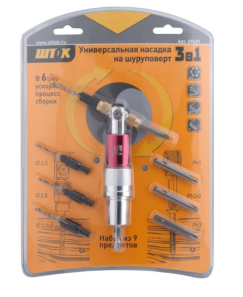 Многофункциональная насадка на шуруповерт ШТОК 09401 это универсальная насадка на шуруповерт 3 в 1 и предназначена для предварительного рассверливания отверстия, зенкерования и заворачивания шурупа. Применяется для сверления и заворачивания в дерево, ДСП, ДВП, пластик, цветные металлы. Сверла, мм: 2,5; 2,8; 2х3,2. Биты Ph1, Ph2x2, Ph3.