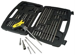 Отвертка со сменными жалами Stanley "Fatmax" 43 предмета 0-96-222 обладает Т-образной рукояткой с храповым механизмом. Высокопрочная эргономичная рукоятка. Множество сменных вставок с шестигранным хвостовиком 1/4 в комплекте. Компактный и прочный футляр для безопасного хранения. Состав набора: вставки 35 мм под шлиц Pozidriv: PZ1-PZ2 x 2-PZ3; Вставки 35 мм под прямой шлиц: 3-4,5 мм; Вставки 35 мм под шестигранный шлиц: 2.5-3-4-5-6-8 мм; Вставки 100 мм под шлиц Pozidriv: PZ1-PZ2; Вставки 150 мм под шлиц Pozidriv: PZ1-PZ2-PZ3; Вставка 200 мм под шлиц Pozidriv: PZ2; Вставки 100 мм под шестигранный шлиц: 2.5-3 мм; Вставки 150 мм под шестигранный шлиц: 4-5-6 мм; Вставка 200 мм под шестигранный шлиц: 8 мм; Вставки 150 мм под шлиц Torx: T15-T20-T25; Вставки 50 мм под шлиц Torx: T15-T20-T25; Вставки 150 мм под шлиц Phillips: PH1-PH2; Вставка 150 мм под прямой шлиц: 6,8 мм; Вставки 50 мм под шлиц Phillips: PH1-PH2; Вставки 50 мм под прямой шлиц: 6,8 мм; Рукоятка Т-образная с трещоткой; Вставки с торцевыми головками: 8-10-12 мм; Держатель для вставок 1/4 x 2 шт. Практичный пластиковый футляр.