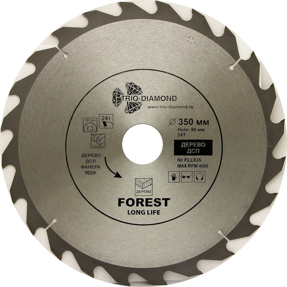 Пильный диск по дереву 350x24Tx50 мм Trio-Diamond FLL835 предназначен для резки дерева, ДСП, фанеры.