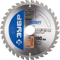 Пильный диск ЗУБР "Эксперт-Оптимальный рез" 190х30, 36Т Зубр 36903-190-30-36 имеет среднее количество зубьев и предназначен для оптимального (быстрого и аккуратного) продольного и поперечного распила мягкой и твердой древесины естественной влажности, фанеры, ДСП с покрытием циркулярными пилами. Зубья усилены твердосплавными карбидвольфрамовыми пластинами ВК8. Автоматическая трехсторонняя заточка и шлифовка каждого зуба обеспечивают их правильную геометрию. Форма зубьев: вершина с переменным скосом (АТВ) 15°.