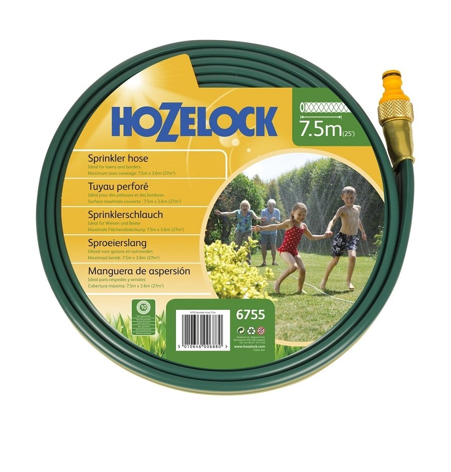 Шланг HoZelock 6755 разбрызгивающий для полива 7,5м Б0055346 - перфорированный плоский шланг, используемый для мелкого распыления по газонам и цветам в саду, а при переворачивании вверх дном - для глубокого замачивания цветочных клумб и бордюров. Плоская конструкция гарантирует, что спринклерный шланг остается на месте и правильно поднимается (или опускается). Спринклерный шланг поставляется с фитингами для соединения нескольких отрезков шланга, если требуется.