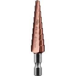 Ступенчатое сверло по металлу Зубр Профессионал Кобальт 4-12 шестигранный хвостовик 1/4 29672-4-12-9_z01 рекомендовано для сверления листового металла толщиной до 4мм, цветных металлов, пластика и других материалов. Диаметры: 4-5-6-7-8-9-10-11-12мм.