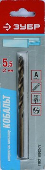 Сверло по металлу ЗУБР Кобальт спиральное, 5,5х93мм 4-29626-093-5.5 предназначено для выполнения сквозных и глухих отверстий в металлических заготовках из легированной, углеродистой, нержавеющей и труднообрабатываемой стали с пределом прочности при растяжении до 1000 Н/мм2, цветных металлах и других материалах. Сверло изготовлено из высокопроизводительной, быстрорежущей стали Р6М5K5 с содержанием кобальта 5%. Угол режущей части 135 градусов. Оснастка имеет цилиндрический хвостовик. Работает в правом направлении. Класс точности сверла А1. Изготовлено в соответствии с требованиями ГОСТ 10902-77.